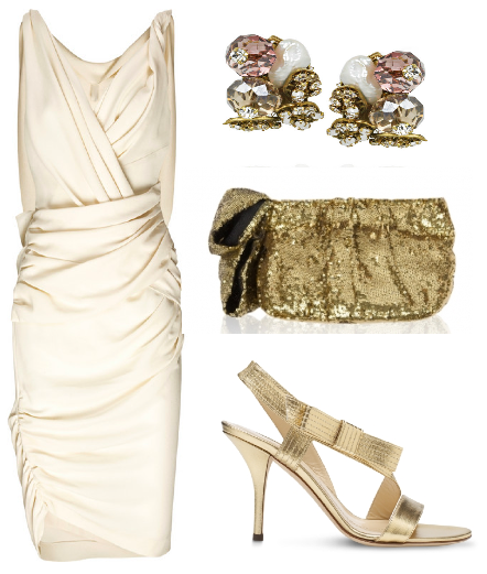 (vionnet draped silk dress, bijoux heart earrings, felix rey clutch and kate spade slingbacks)