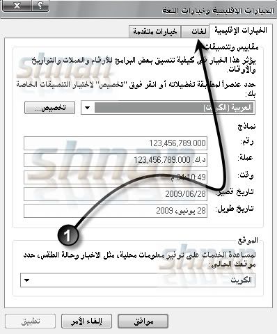 روحي ستارت بعدها كنترول بنل بعدها عند شكل الكرة الارضيه (الخيارات الاقليميه )