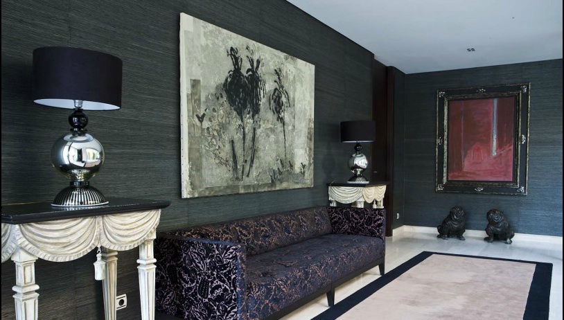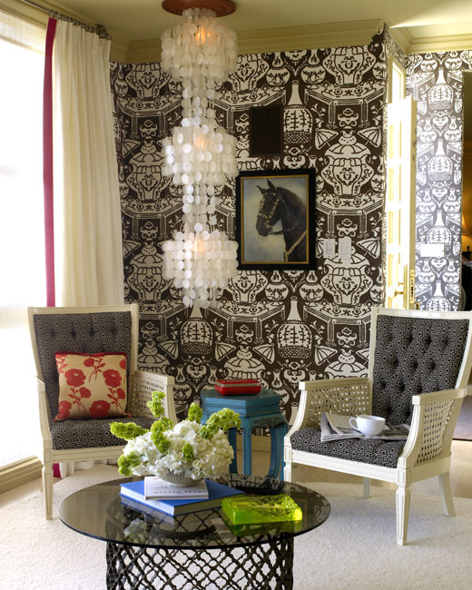 This nursery is over the top with a Murano chandelier and fancy curtains. I think the crib has too much wood but the wallpaper is beautiful.